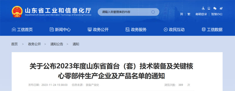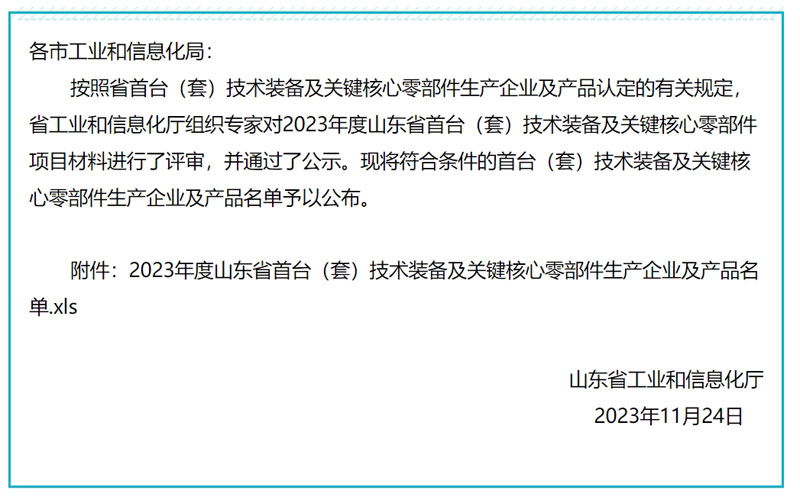 山東(dōng)省工業和信息化廳關於公布2023年度山東省首(shǒu)台(套(tào))技術(shù)裝備及關鍵核心零(líng)部件生產企業及產品名(míng)單的通(tōng)知